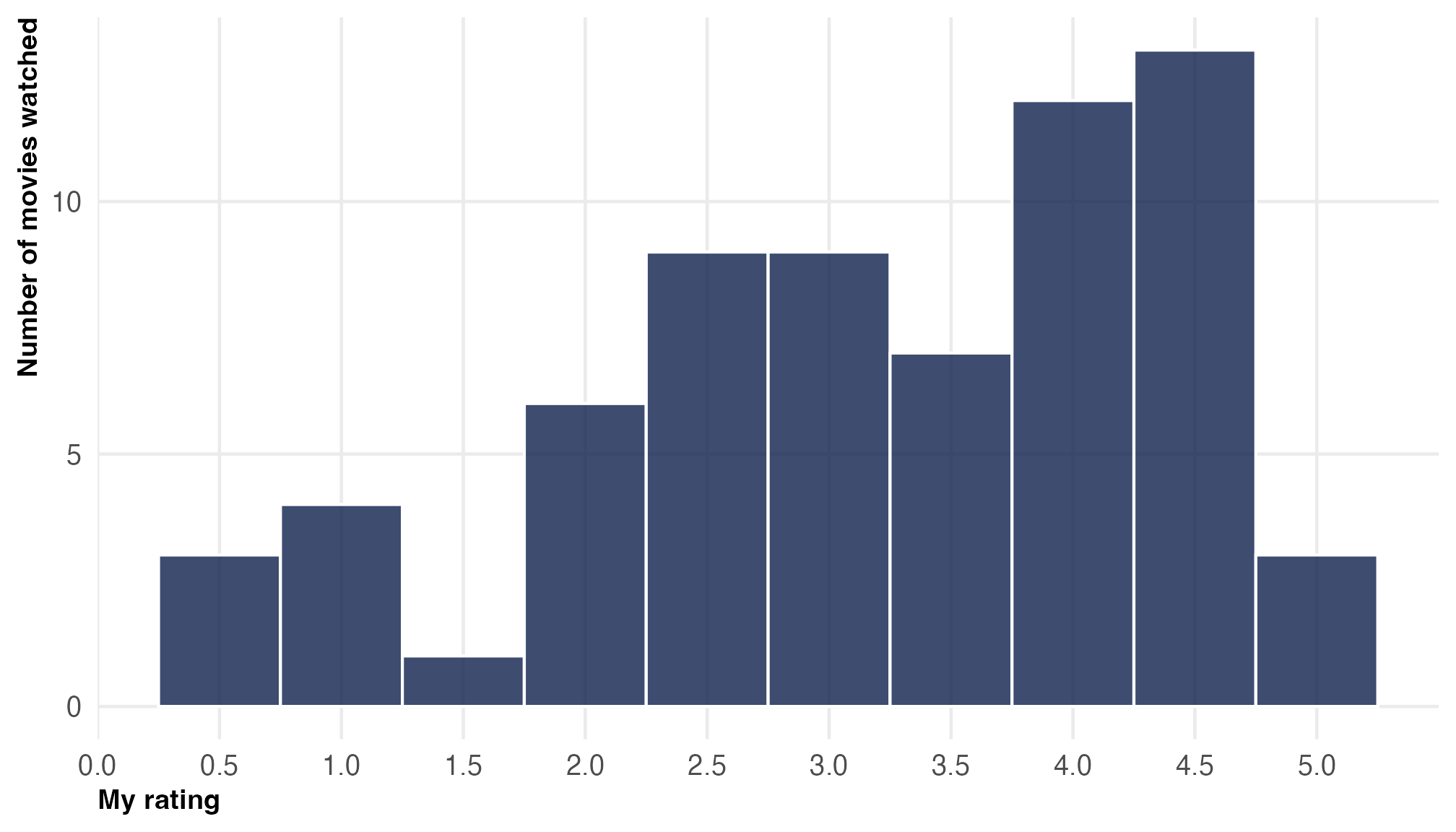 And here’s the distribution of ratings, for fun: