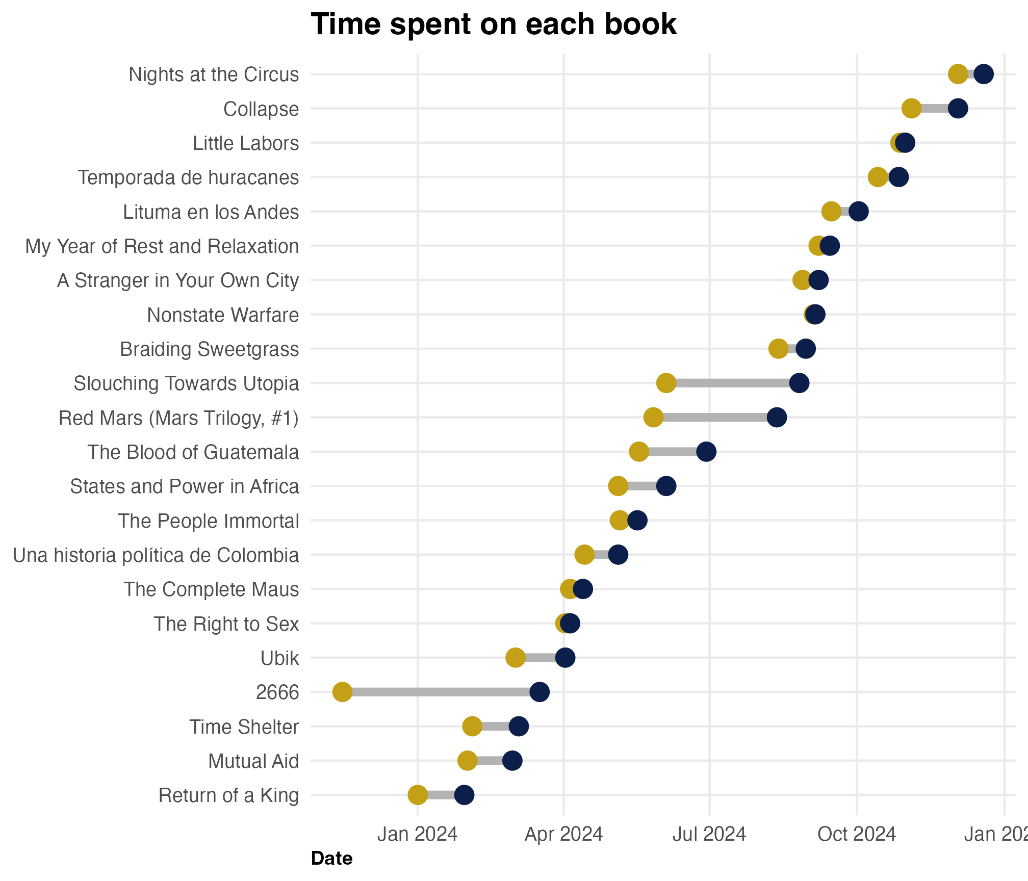 How long am I spending on each book? Caveat: the dates added / read are approximations in some cases.