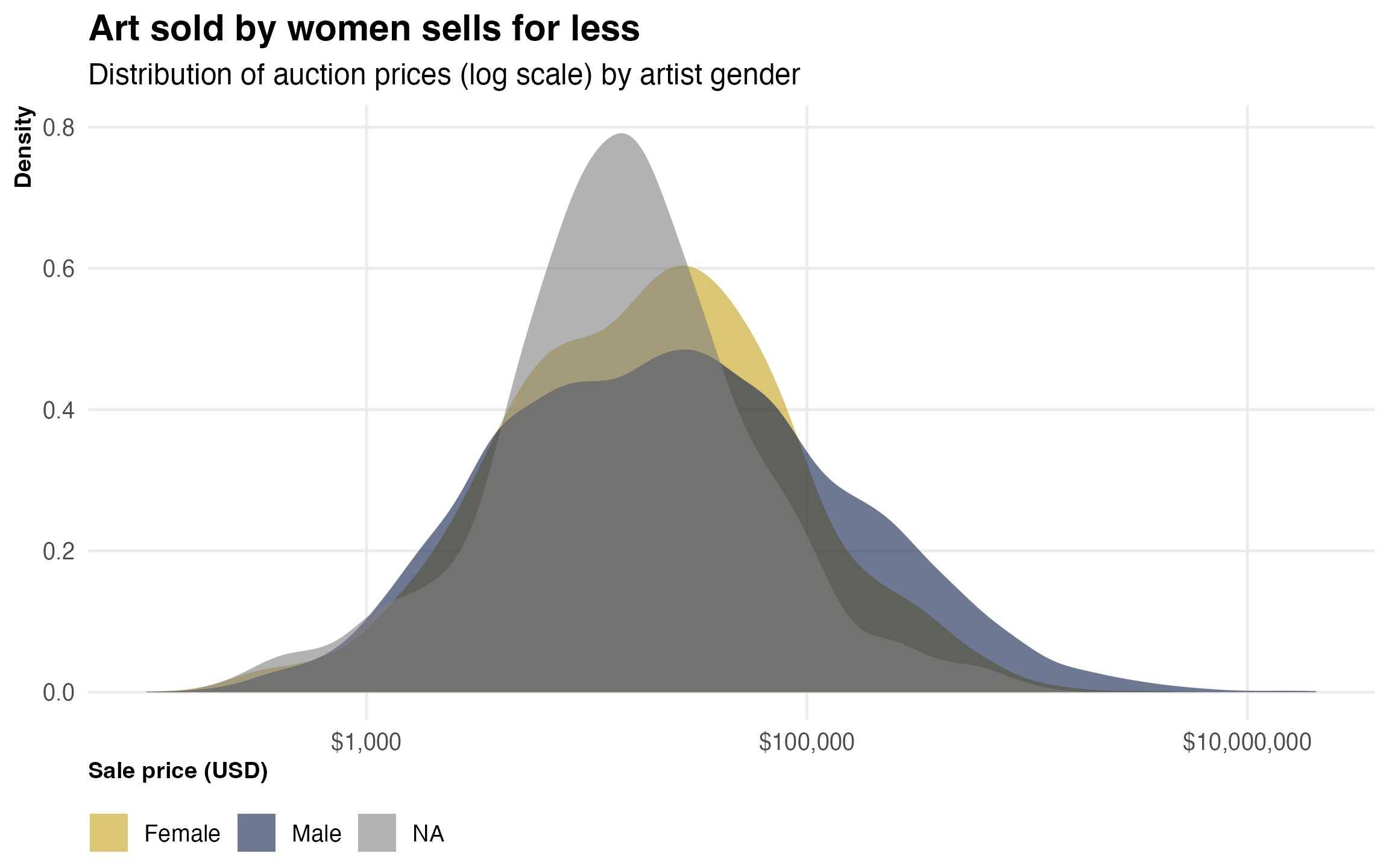 art|>filter(real_price_usd>0)|>mutate(gender =if_else(gender_male==1, "Male", "Female"))|>ggplot(aes(x =real_price_usd, fill =gender))+geom_density(alpha =0.6, color =NA)+scale_x_log10(labels =scales::dollar_format())+scale_fill_manual(values =pal[c(1, 7)])+labs( title ="Art sold by women sells for less", subtitle ="Distribution of auction prices (log scale) by artist gender", x ="Sale price (USD)", y ="Density", fill =NULL)