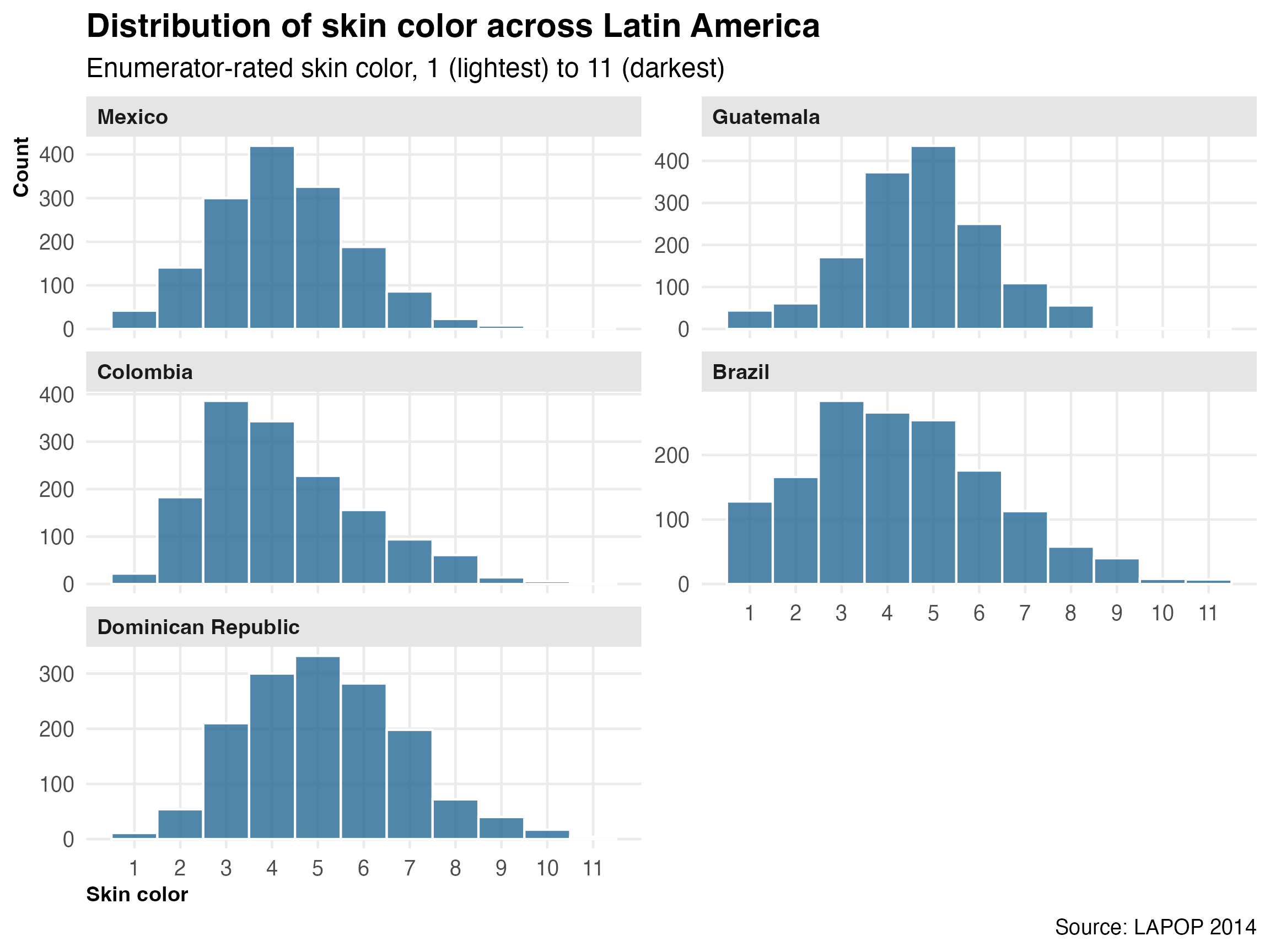 race|>filter(!is.na(colorr), !is.na(pais))|>ggplot(aes(x =colorr))+geom_histogram(binwidth =1, fill =pal[5], color ="white", alpha =0.8)+facet_wrap(~pais, scales ="free_y", ncol =2)+scale_x_continuous(breaks =1:11)+labs( title ="Distribution of skin color across Latin America", subtitle ="Enumerator-rated skin color, 1 (lightest) to 11 (darkest)", x ="Skin color", y ="Count", caption ="Source: LAPOP 2014")